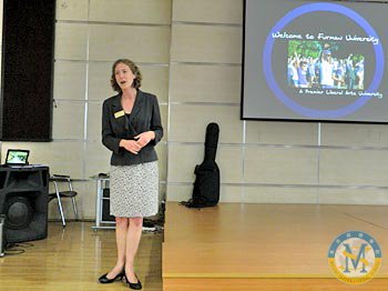 2012年10月10日,美國福爾曼大學(xué)亞洲區(qū)招生顧問Martha Kimmel女士應(yīng)邀到我校國際項目部禮堂為高中生做大學(xué)升學(xué)現(xiàn)場指導(dǎo)。這是Kimmel女士第三次來校為我校高中學(xué)生做招生專題演講。 Kimmel女士向我校學(xué)生介紹了如何申請福爾曼大學(xué)以及與該大學(xué)相關(guān)的專業(yè)選擇問題。同時,她還問及學(xué)生們的興趣與愛好。通過Kimmel女士對福爾曼大學(xué)的介紹,同學(xué)們受益匪淺。
