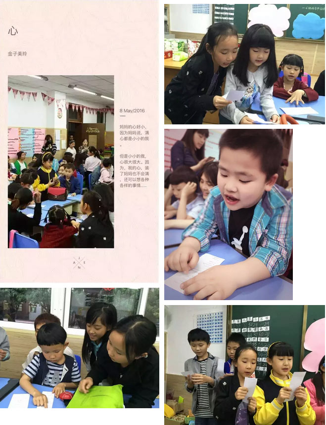 首先,由美視四年級(jí)的大哥哥大姐姐們分組帶著小朋友,為媽媽們朗誦了金子美玲阿姨的優(yōu)美小詩。