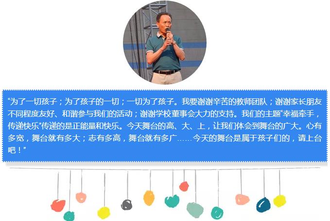 “幸福是簡(jiǎn)單的,幸福是沒(méi)有理由的,幸福更是一種無(wú)法用語(yǔ)言表達(dá)的滿(mǎn)足。在美視,幸福是孩子們一張張燦爛的笑臉,幸福是伙伴們共同成長(zhǎng)的點(diǎn)滴,幸福更是美視人最難忘懷的快樂(lè)……在踐行“PYP”理念的道路上,美視的乖娃娃們?cè)诶蠋煹囊I(lǐng)下?tīng)渴智靶?,他們共同探究、學(xué)會(huì)思考、交流和反思。他們敢于嘗試,互相理解、包容;他們會(huì)分享懂感恩。今天,是屬于我們的節(jié)日“六一”,美視的小伙伴們又將歡歌起舞,站上舞臺(tái)幸福地牽手,共同傳遞那一份份屬于童年的愛(ài)與感動(dòng)。”