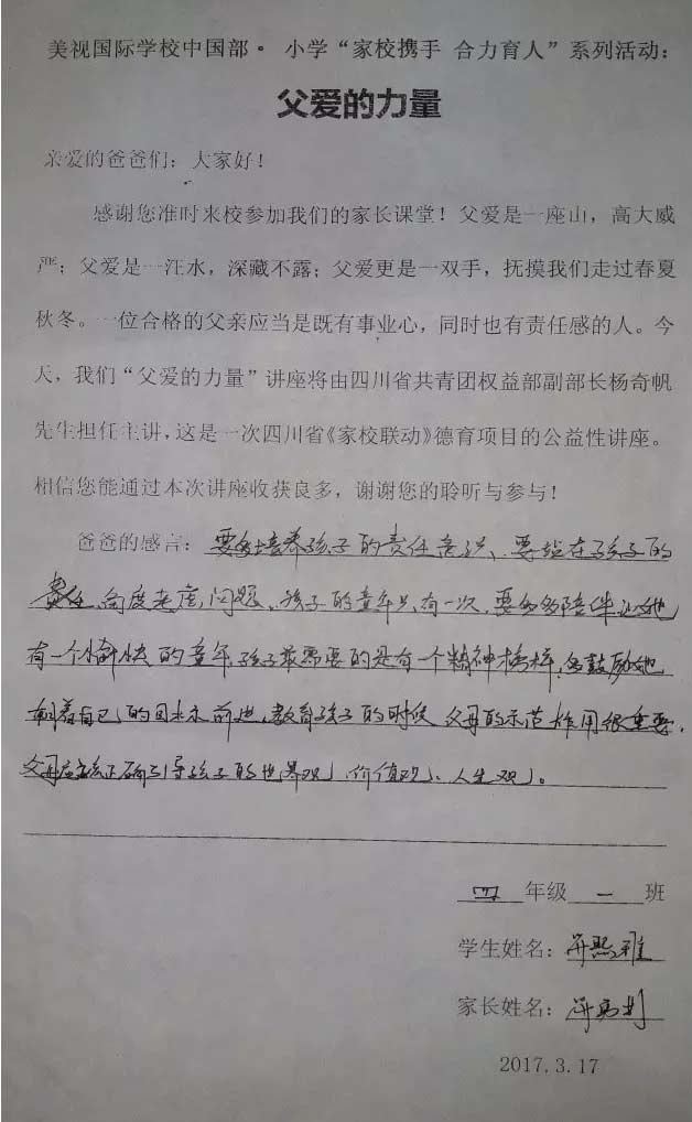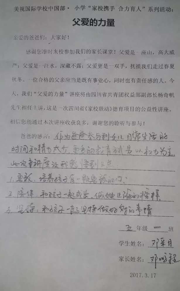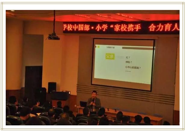 我們四、五年級的家長有幸一起聆聽了中國部·小學(xué)“家校攜手 合力育人”系列活動之“父愛的力量”的講座,其中來參加的絕大部分是爸爸,作為爸爸中的一員,聽了以后感觸頗多。