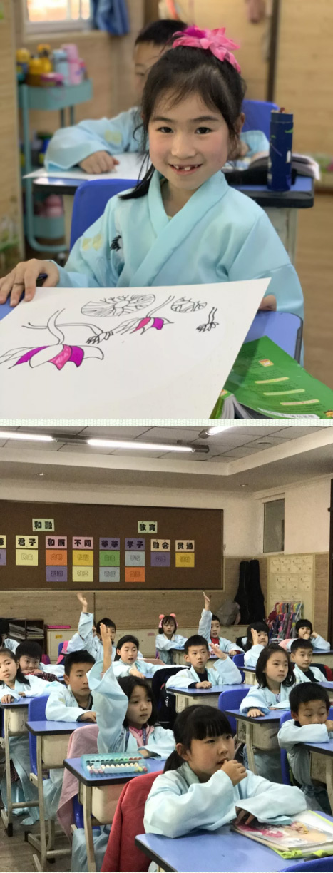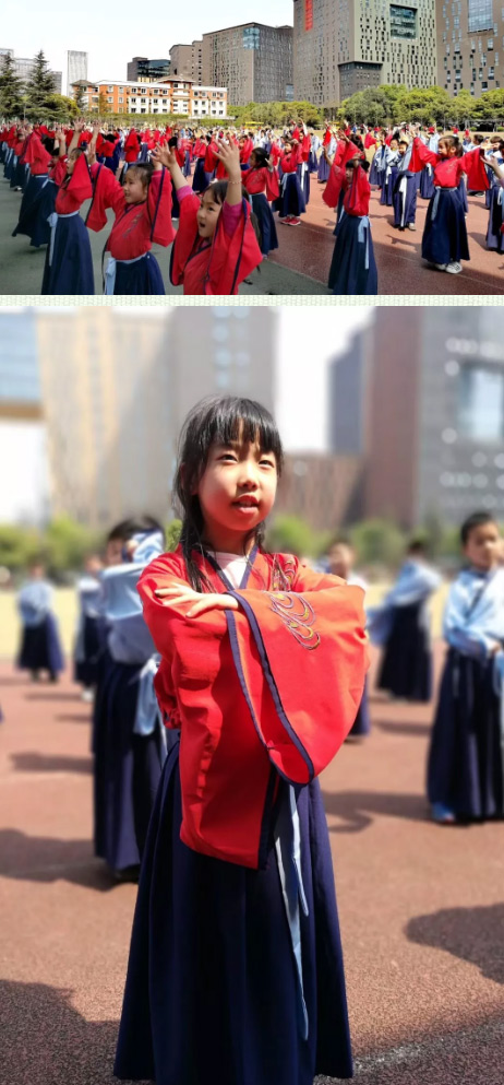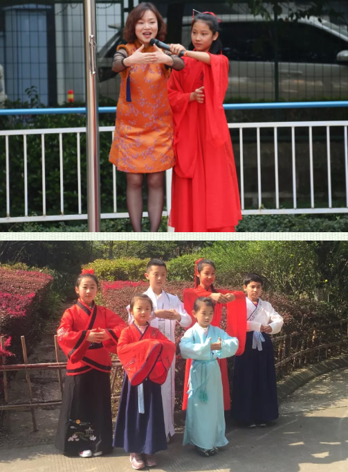 一年級(jí)的小朋友們穿上漂亮的漢服,時(shí)而誦,時(shí)而唱。伴隨優(yōu)美的動(dòng)作翩翩起舞。