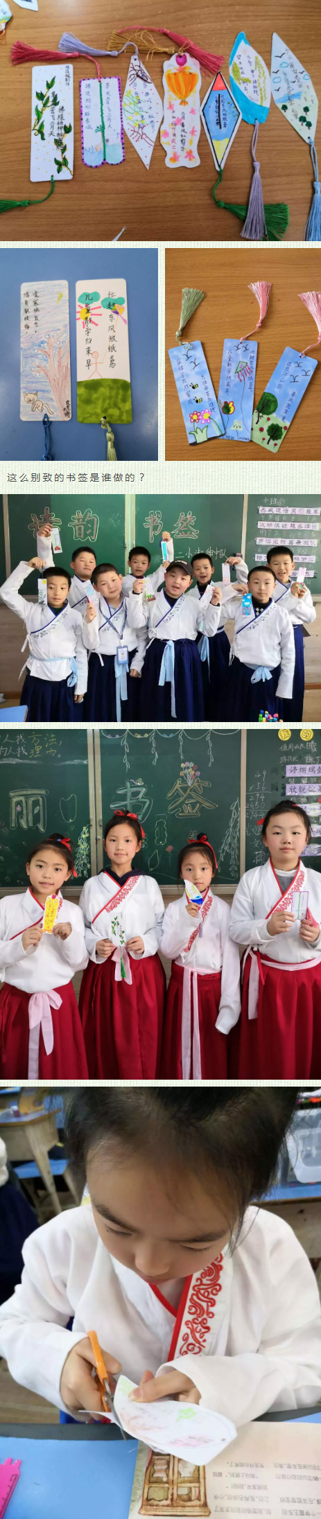 他們抄古詩,畫古詩,親手制作漂亮雅致的詩韻書簽。這一方小小的書簽,承載著他們一個(gè)大大的夢(mèng)想:我們愛中華,我們是傳承人!