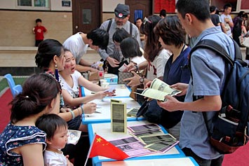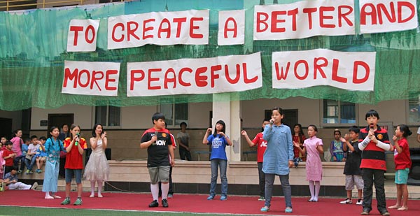 2014年4月30日,融合部家長(zhǎng)、學(xué)生、教職員工在融合部教學(xué)樓歡慶“國(guó)際日”。