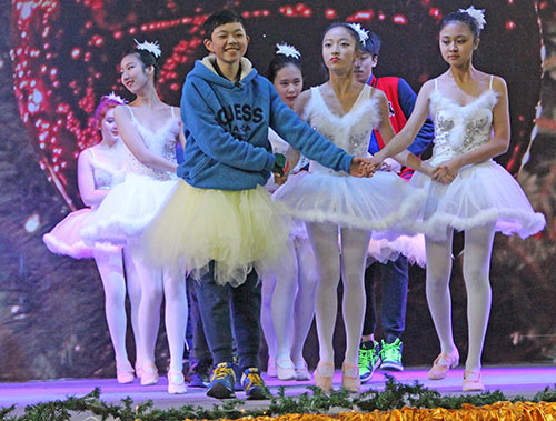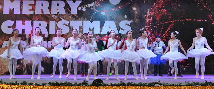 各個(gè)年級(jí)的同學(xué)們隨后給大家?guī)?lái)了歡快的舞蹈和優(yōu)美的歌聲,把圣誕新年慶典推向了一個(gè)又一個(gè)的高潮。尤其是九年級(jí)同學(xué)帶來(lái)的舞蹈“Swan”,看著平時(shí)嫻靜甜美的女孩子們跳著優(yōu)雅的芭蕾,讓人移不開(kāi)眼睛;而平時(shí)英俊帥氣的男孩子們穿上天鵝裙跳舞的樣子,又讓大家忍俊不禁。