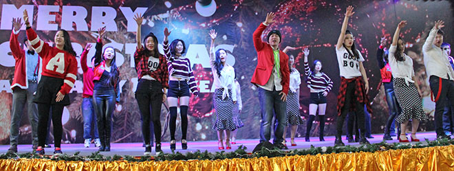 在安詳圣潔的“Oh, holy night”的音樂(lè)聲中,七、八年級(jí)的同學(xué)將大家?guī)肓私裉斓氖フQ新年慶典。