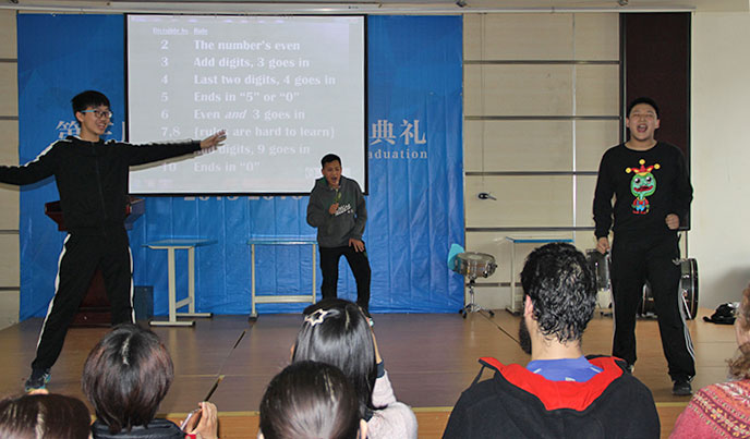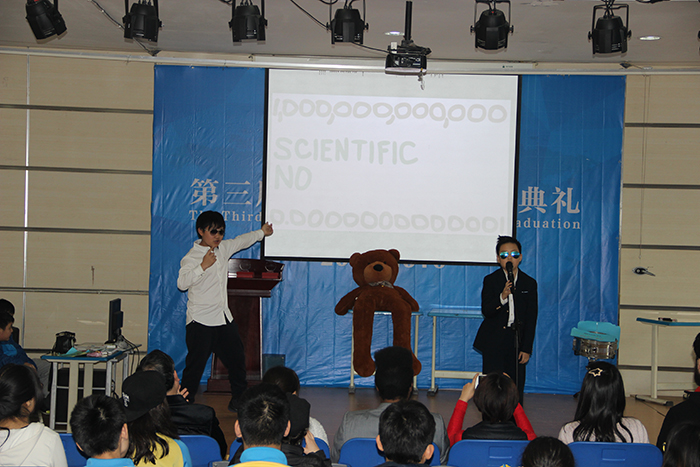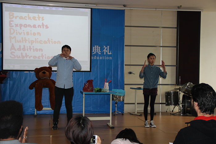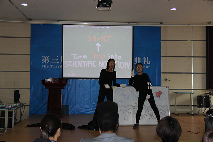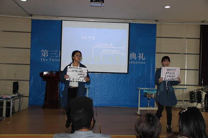 2016年3月4日下午在融合部禮堂里舉行了數(shù)學唱歌比賽,這次比賽由初中數(shù)學老師Ms. Jadie Wang組織,初中學生參加。同學們分年級分組進行表演,他們邊唱邊跳,現(xiàn)場氣氛熱烈。融合部劉校長、副校長Mr. Kevin Blissett 以及部分老師和小學生也作為觀眾,在現(xiàn)場觀看了比賽。最后來自8年級的2組同學們獲得了這次比賽的第一名。