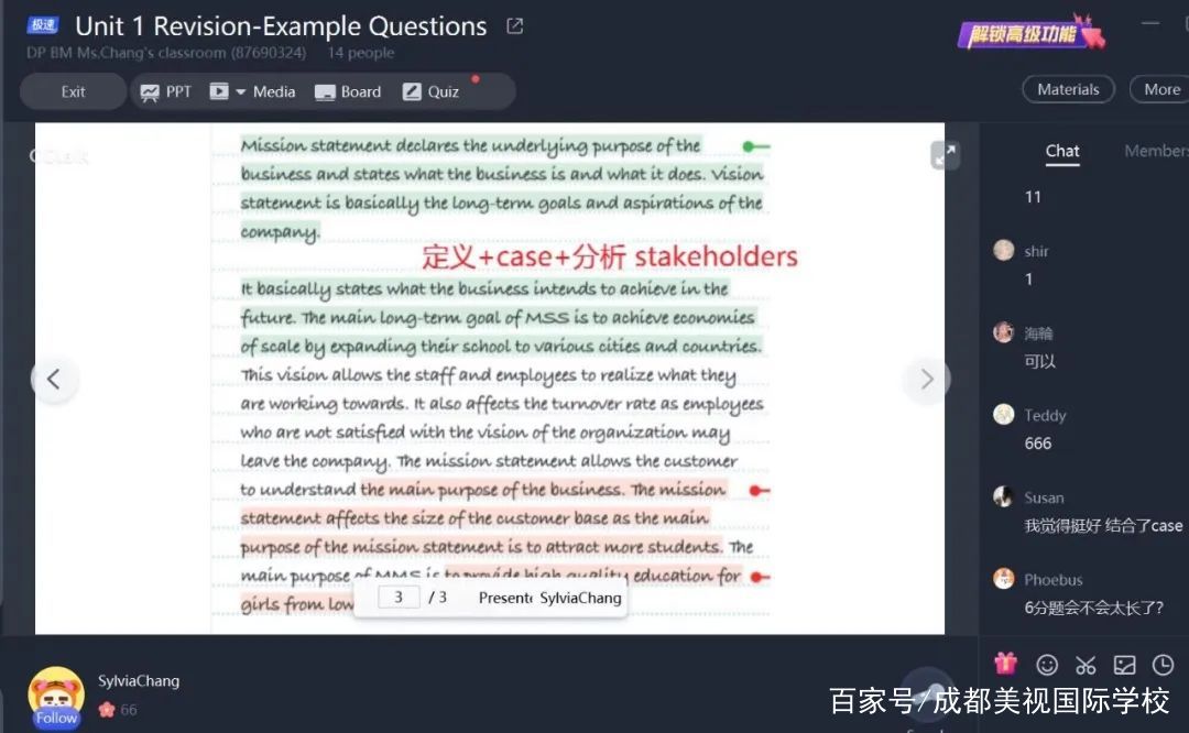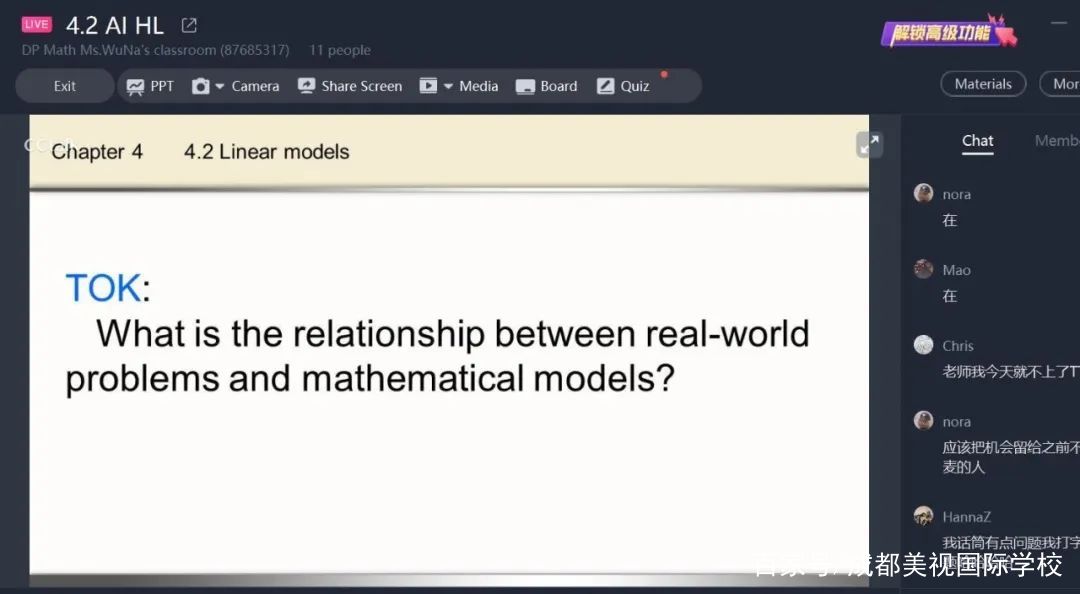 早在疫情剛開始的時候,成都美視師一學(xué)校融合部的領(lǐng)導(dǎo)團(tuán)隊就在研究各種應(yīng)對延遲開學(xué)的方案,考慮到IB課程沒有現(xiàn)成的網(wǎng)絡(luò)資源,5月份DP畢業(yè)生面臨全球IB統(tǒng)考,各種內(nèi)部評估等。特別是畢業(yè)生的大學(xué)申請工作更是不能怠慢,因為這正是關(guān)系到同學(xué)們海外留學(xué)之路的關(guān)鍵時刻,所以篩選出一個滿足中外籍師生需求的教學(xué)平臺就顯得尤為重要,最終經(jīng)過多方比較,調(diào)研,我們選擇了cctalk平臺進(jìn)行上課,此平臺可以提供錄播、在線直播、回放的功能,學(xué)生可以在線和老師交流互動。