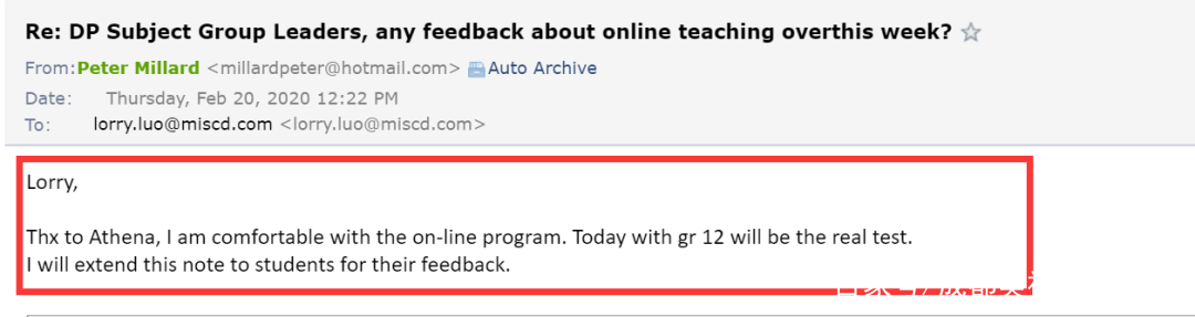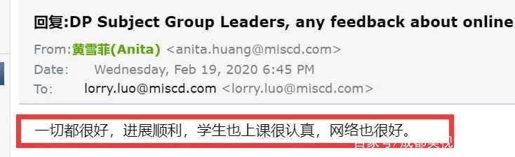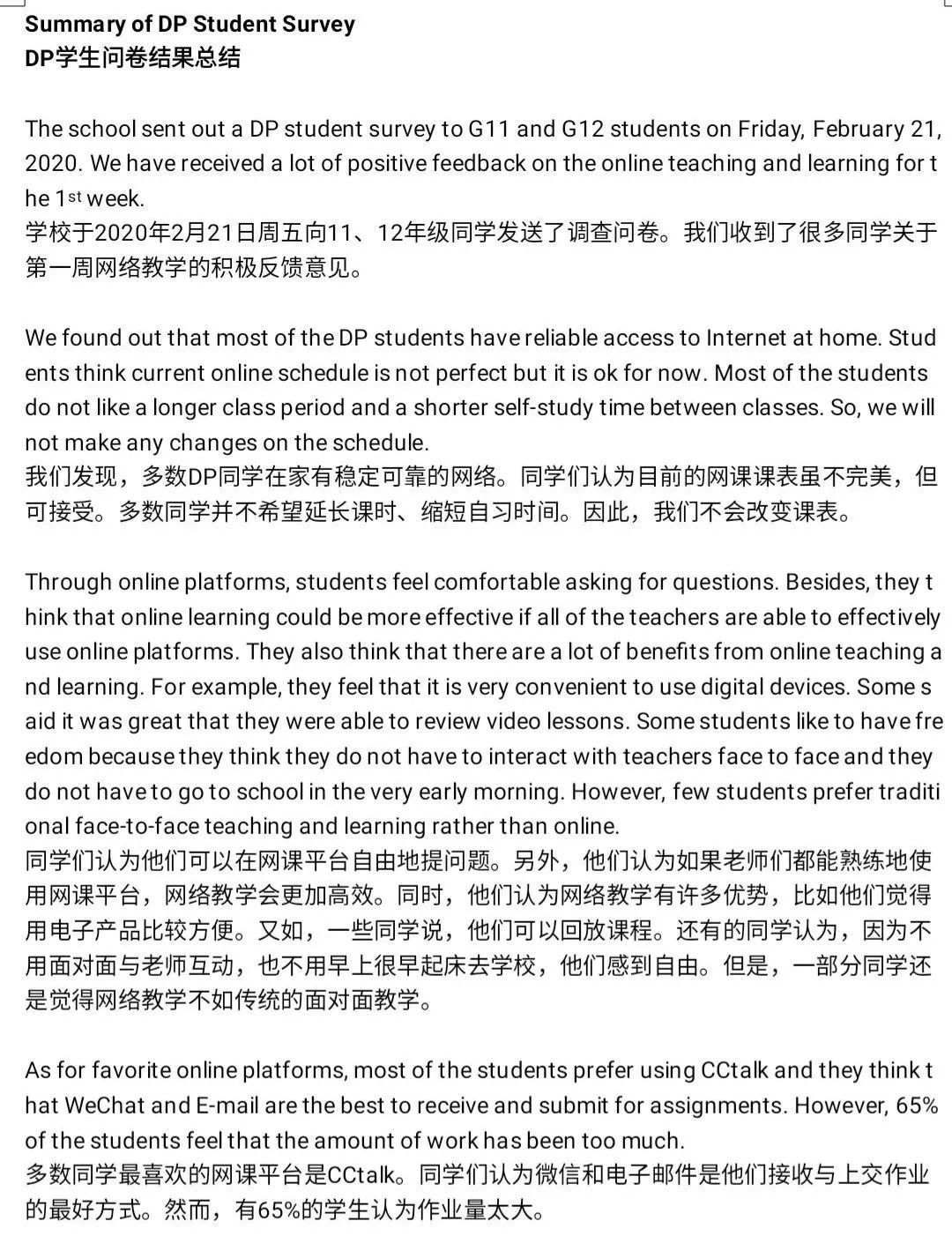 為保證在線教學(xué)質(zhì)量,校長及項目協(xié)調(diào)員要求學(xué)科老師們提交教學(xué)計劃,學(xué)生學(xué)習(xí)任務(wù)計劃,并不定時進(jìn)課堂觀摩教學(xué),并在課后和老師充分溝通,提供寶貴的建議和意見;在同學(xué)們完成在線學(xué)習(xí)任務(wù)的同時,我們的班主任、教學(xué)助理、IT老師也沒有閑著,他們?nèi)膛惆椋S時幫助學(xué)生們熟悉各種平臺進(jìn)行答疑。