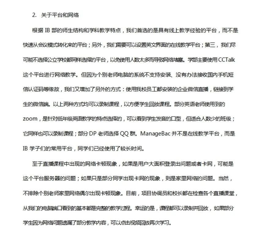 關(guān)于作業(yè)的布置,這也是一個同學(xué)家長比較關(guān)心的話題,網(wǎng)課期間,老師和學(xué)生可以通過ManageBac, CCtalk,電子郵件等方式進(jìn)行資料上傳、作業(yè)發(fā)布和提交,這兩個平臺是平時大家一直使用的,學(xué)生操作起來也較熟悉,同時,考慮到學(xué)生長時間上網(wǎng)課的用眼衛(wèi)生,各學(xué)科老師盡可能地讓學(xué)生用紙和筆的方式完成作業(yè)。