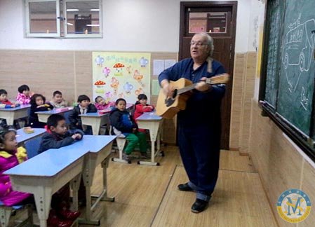 外教John背著吉他走進(jìn)課堂。我們唱的可開心啦!