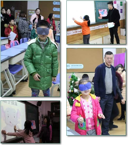 “瞎子摸象”活動(dòng)處,爸爸媽媽和孩子們默契配合。