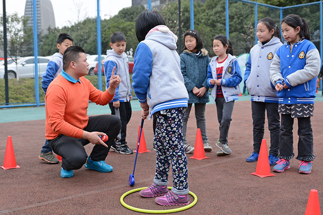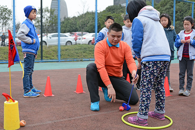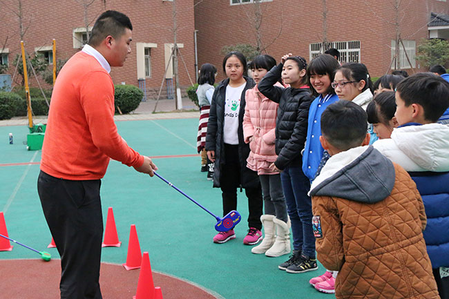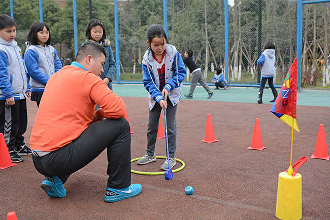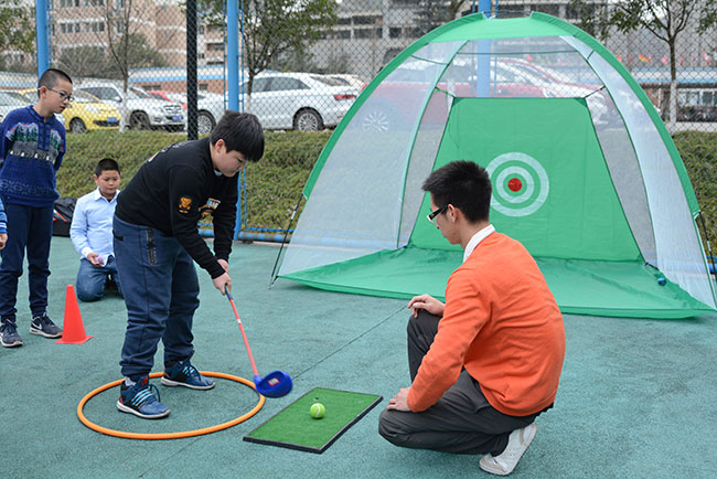 每一次的實踐課教練們都會背上重重的高爾夫運動器材走進(jìn)教室向各班孩子介紹相關(guān)知識。同學(xué)們不僅了解了這項運動的起源、意義、相關(guān)禮儀,還觀看了著名高爾夫球員的相關(guān)視頻,從而對這項運動更加期待。接著,孩子們來到操場體驗高爾夫運動。教練們認(rèn)真示范,以職業(yè)球員的實戰(zhàn)經(jīng)驗來指導(dǎo)每一個孩子。他們?nèi)诤弦惶捉】悼茖W(xué)的青少年教學(xué)體系,不僅專注于球技,也注重青少年運動技能開發(fā),幫助孩子們?nèi)娼】党砷L。教練宣布運動規(guī)則,每一位同學(xué)興致盎然,他們專心致志,積極探究。從熱身運動開始,再到認(rèn)識球桿,接著教練們示范握桿姿勢,每一個環(huán)節(jié)都講解得特別詳細(xì)。同學(xué)們眼中充滿期待,恨不得馬上可以擊出一球。