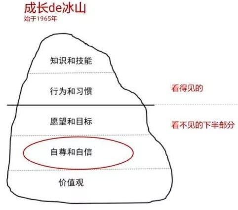 一個(gè)人的“自我”就像一座漂浮在水面上的巨大冰山。能夠被外界看到的行為表現(xiàn)或應(yīng)對(duì)方式——“知識(shí)和技能”、“行動(dòng)和習(xí)慣”,只是露在水面上很小的一部分,而暗涌在水面之下更大的山體,則是長(zhǎng)期壓抑并被我們忽略的“內(nèi)在”——“愿望和目標(biāo)”、“自尊與自信”、“價(jià)值觀”。
