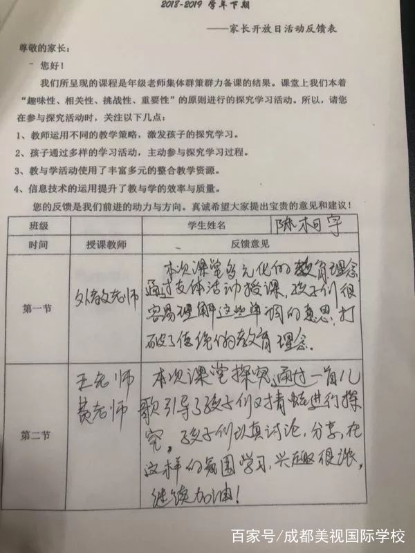 開放課非常好,不管是探究課還是英語課,以下幾點特別有感受:一是所有學(xué)生活躍,愉快的氛圍,能提高孩子的吸收能力??吹贸鰜恚蠋焸兪腔撕芏嘈乃荚O(shè)計,才有這樣高質(zhì)量的課程,90分鐘的兩節(jié)課,我感覺才十幾分鐘。老師們不僅傳授知識,也很有愛,孩子的參與感特別強,在參與過程中,就有更多思考和表達的機會,并提高自信。二是內(nèi)容很好,設(shè)計內(nèi)容能夠打開孩子視野,關(guān)注社會現(xiàn)象,又是孩子身邊能理解的內(nèi)容。三是節(jié)奏很緊湊,40多分鐘內(nèi)容豐富。從孩子們自如的狀態(tài),愉快的笑容就能看出來。張校長分享了美視教學(xué)理念中的五大要點——“知識,技能,概念,態(tài)度,行動”,對我很有啟發(fā)。我感覺這樣的課程內(nèi)容,很好地融合了這五個要點。作為家長,參加了這次活動后,感覺很踏實,這正是我們需要的學(xué)校。感謝學(xué)校和老師安排的開放課,希望以后繼續(xù)有這類活動,讓我們家長能夠?qū)W(xué)校教育有更多了解和理解,共同努力,教育好孩子。