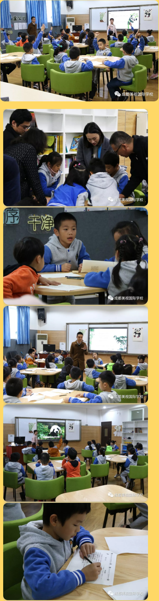 語文、數(shù)學、社會和科學四大學科有機融合,兩位班級老師密切協(xié)作,循序漸進地帶領孩子們探索竹子的生長環(huán)境、竹子的用途,再借由竹子和大熊貓的特殊關(guān)系,自然引出大熊貓,進而走向探索人與動物共享自然資源的主要論題。孩子們認真無比,緊跟老師步伐,無論是個人思索還是合作分享,都展示出了自己作為一名IB學習者的學習熱情和學習態(tài)度。