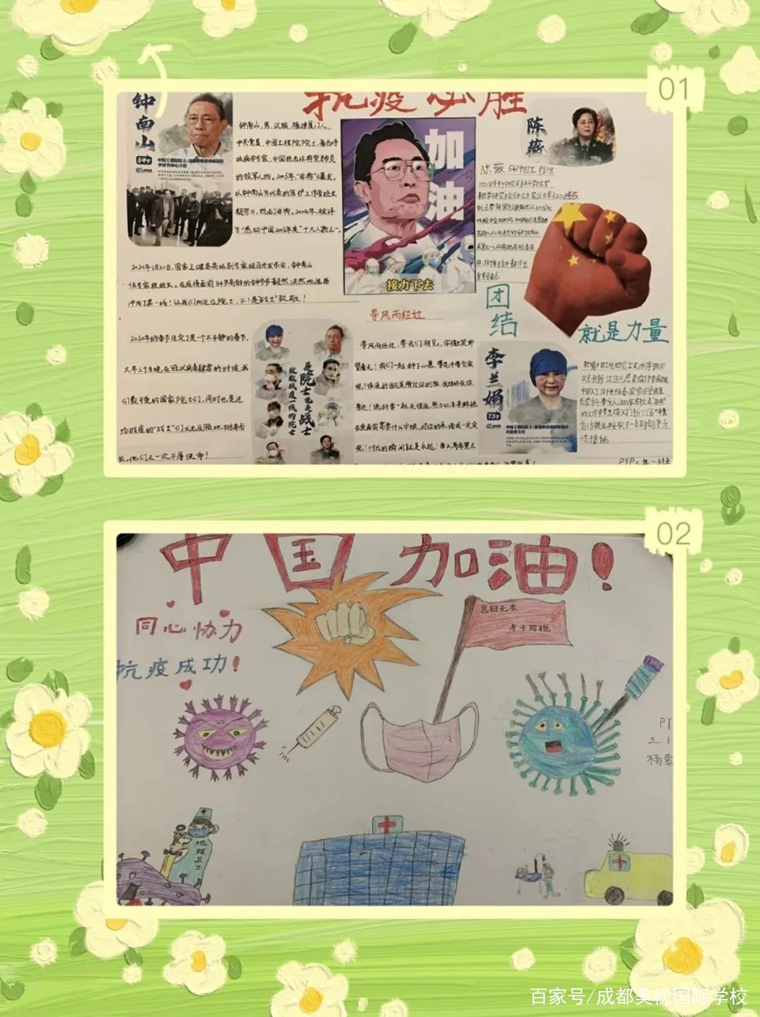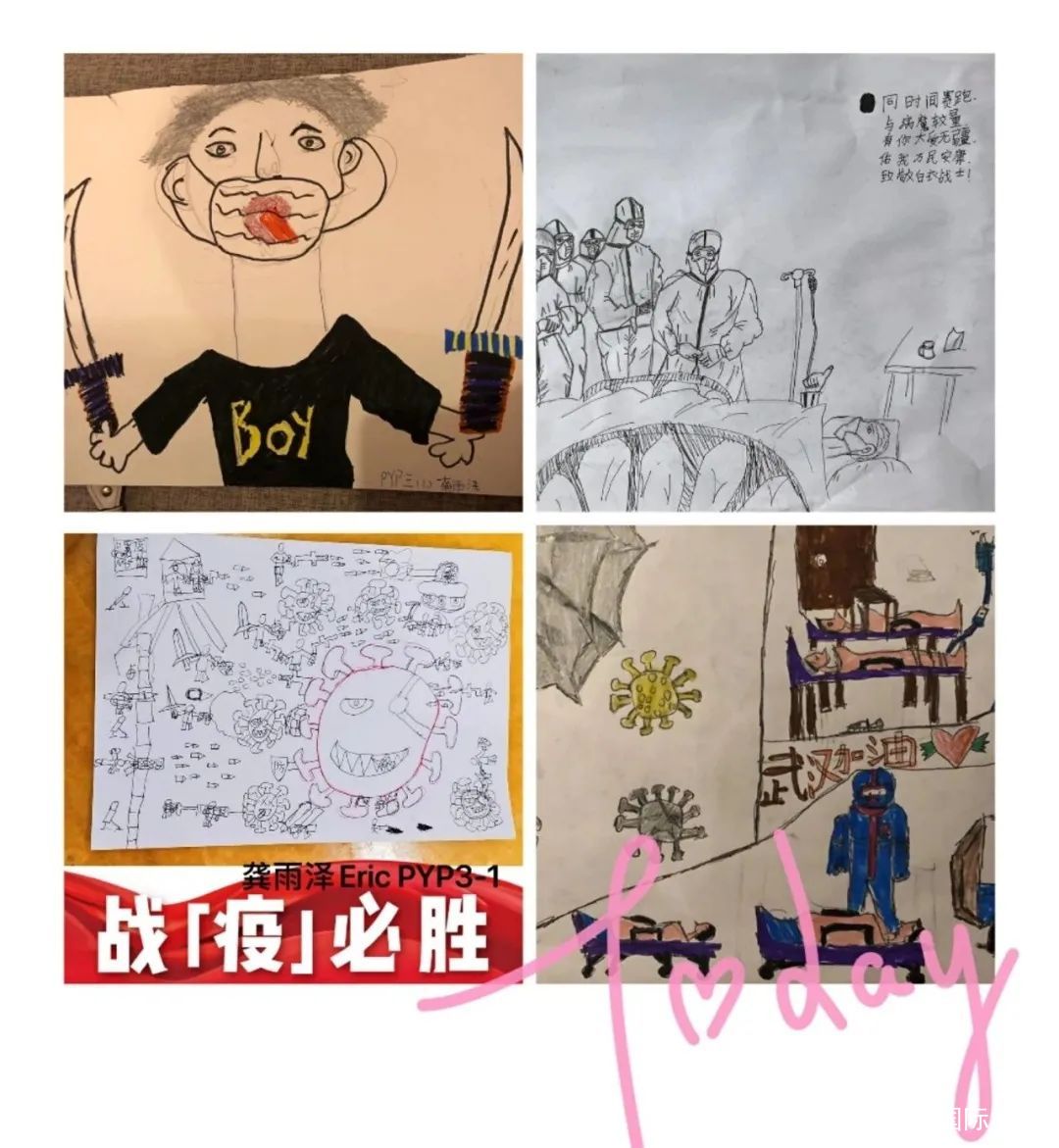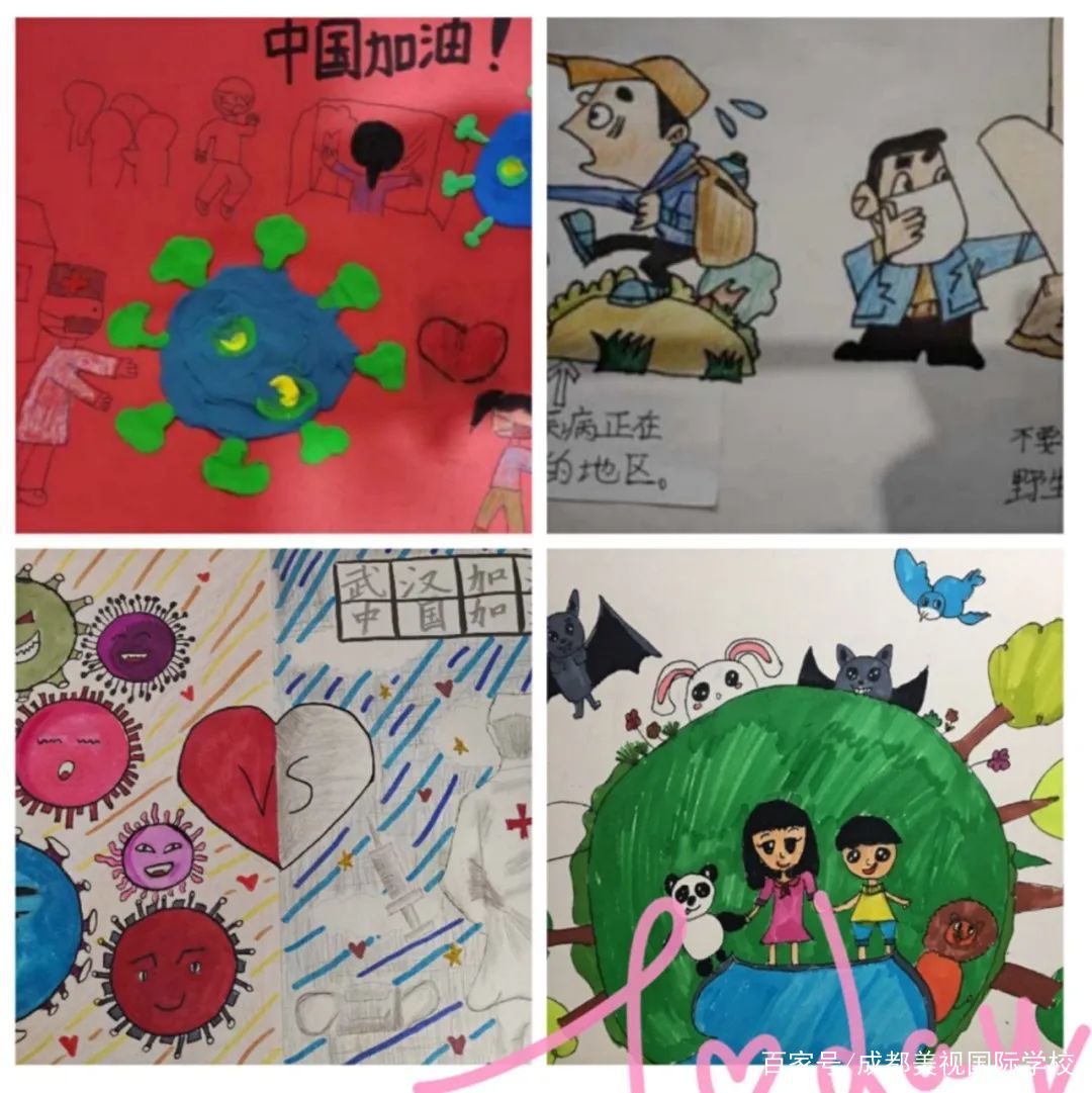 孩子們積極了解有關新冠病毒的相關科學知識,與家人共同踐行居家防護病毒的正確措施,個性設計宣傳海報,繪制“防護指南”漫畫,創(chuàng)編《致敬逆行者》歌曲和詩歌,錄制“武漢加油,中國加油”視頻,給奮戰(zhàn)一線的醫(yī)護工作人員寫慰問感謝信。將PYP探究與社會生活緊密結合,正確認識世界,勇于面對危險,積極迎接挑戰(zhàn),PYP五年級孩子用赤子之心,盡綿薄之力,與國家同呼吸,與民族共命運!