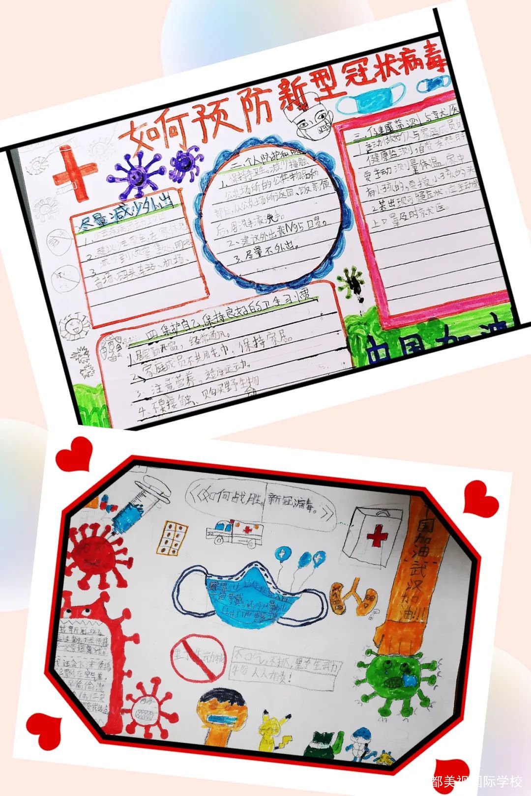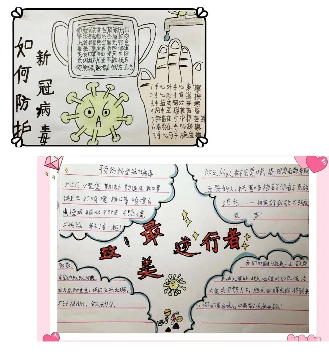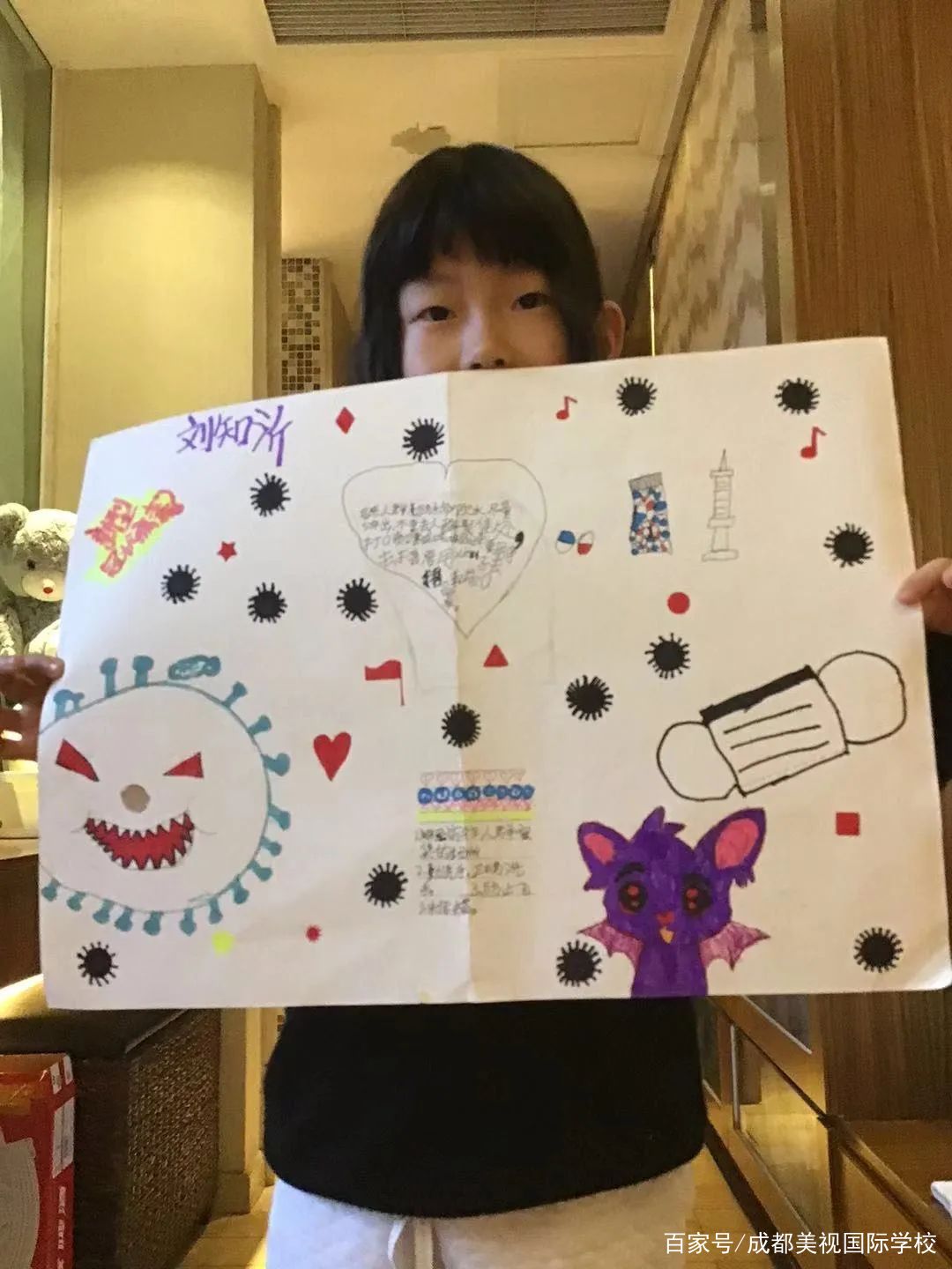 孩子們積極了解有關新冠病毒的相關科學知識,與家人共同踐行居家防護病毒的正確措施,個性設計宣傳海報,繪制“防護指南”漫畫,創(chuàng)編《致敬逆行者》歌曲和詩歌,錄制“武漢加油,中國加油”視頻,給奮戰(zhàn)一線的醫(yī)護工作人員寫慰問感謝信。將PYP探究與社會生活緊密結合,正確認識世界,勇于面對危險,積極迎接挑戰(zhàn),PYP五年級孩子用赤子之心,盡綿薄之力,與國家同呼吸,與民族共命運!