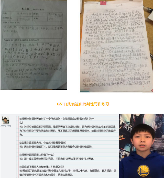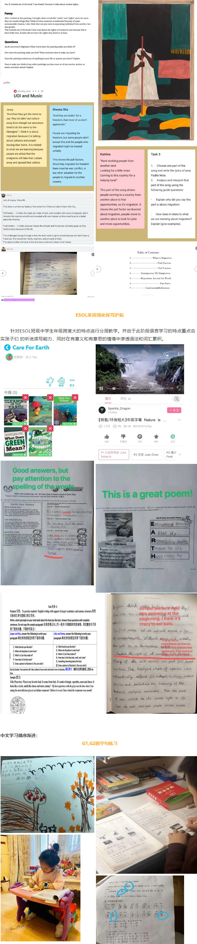 居家學(xué)習(xí)期間G5探究了屬于跨學(xué)科主題“我們所處的時(shí)空”下的話題“移民”。學(xué)生通過(guò)閱讀豐富的移民故事,分析移民原因,并將這些原因分為促使移出和移入兩種因素。通過(guò)使用老師給的引導(dǎo)性問(wèn)題,培養(yǎng)閱讀和寫作技能。學(xué)生探究移民相關(guān)的詞匯,用以訓(xùn)練使用網(wǎng)絡(luò)詞典,以及正確的拼寫單詞。通過(guò)解讀由杰克博·勞倫斯創(chuàng)造的畫作,去理解人們?yōu)槭裁匆泼瘛Mㄟ^(guò)聆聽(tīng)不同的音樂(lè),理解和分析人們移民的原因和方式。學(xué)生圍繞移民提出成立自己的項(xiàng)目,通過(guò)研究過(guò)程,用不同方法展現(xiàn)對(duì)中心思想的理解。