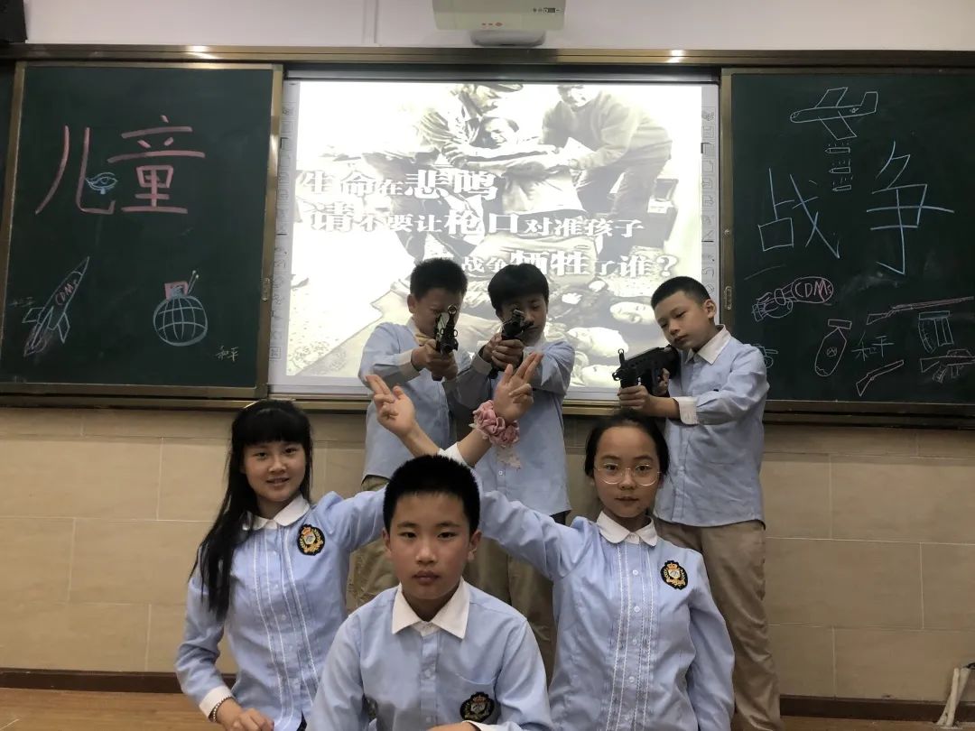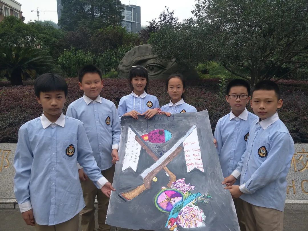 探究過程中,孩子們認識到了戰(zhàn)爭的殘酷血腥一面,也透過戰(zhàn)爭看到了親情、愛情、友情的人性美好,感受到生命的厚重與力量。用自創(chuàng)的美術作品《戰(zhàn)爭中的一家人》、《永久的和平》、朗誦《兒童和平宣言》、主題海報、戰(zhàn)爭專題講座等方式,探究小組向全世界發(fā)出真摯的呼吁:“ 沒有眼淚仇恨,沒有流血離散,共享美好家園!”