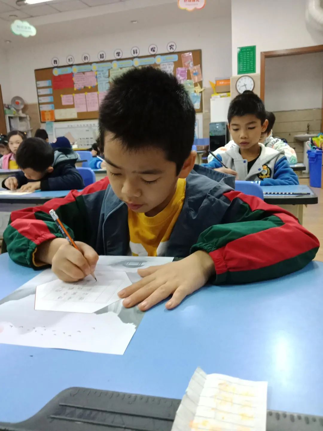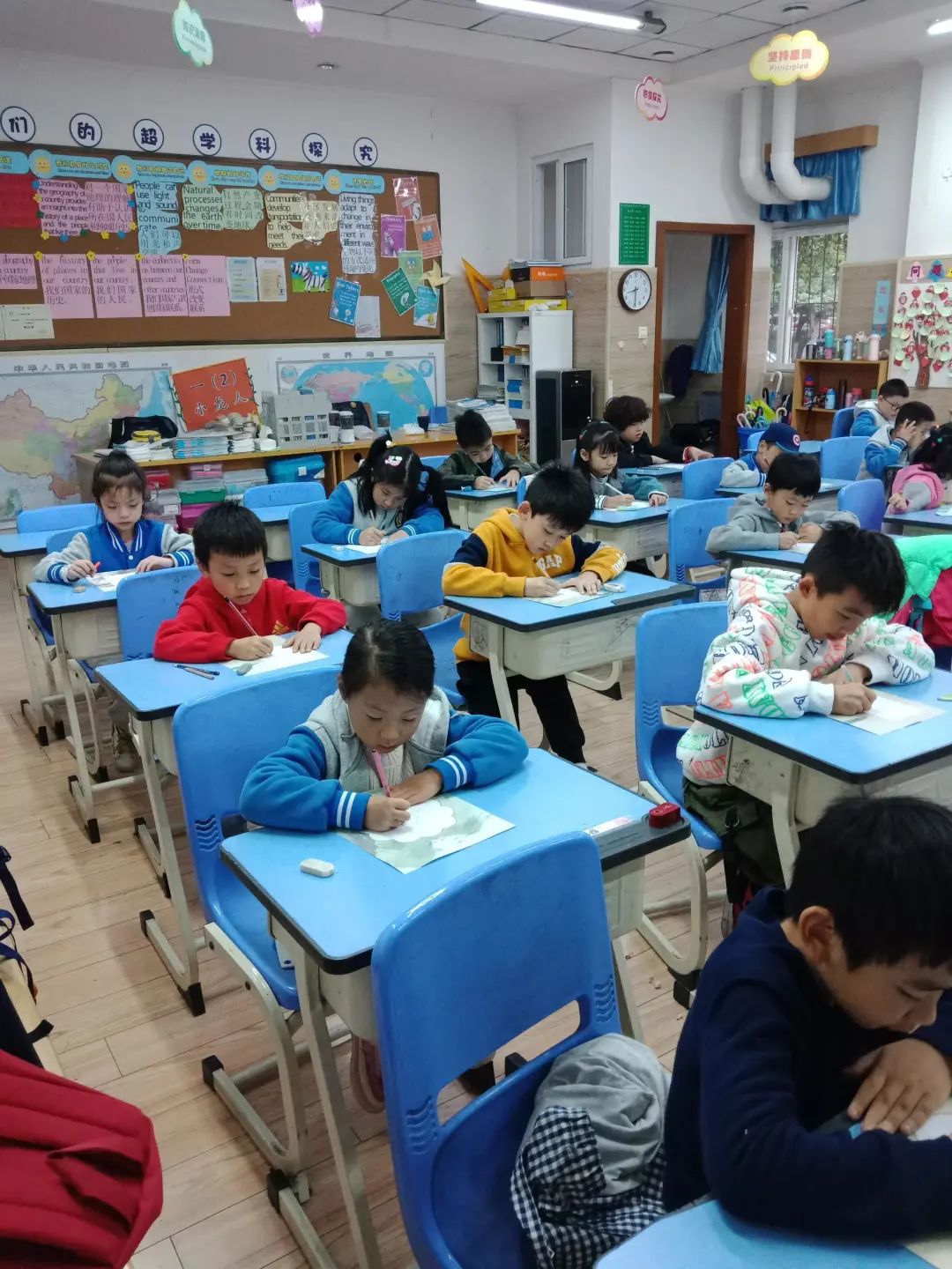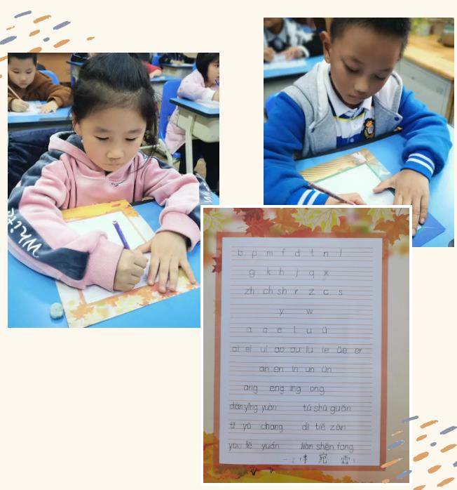 一年級(jí)的小可愛(ài)們精心準(zhǔn)備,坐姿端正,全情投入,寫(xiě)出的拼音和名字美觀(guān)規(guī)范,賞心悅目。