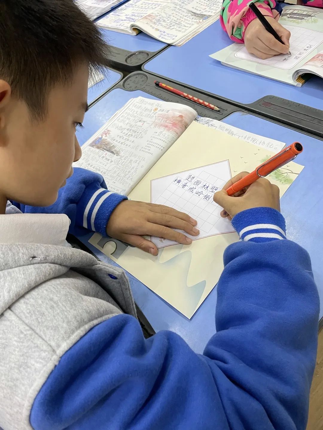 四年級(jí)的學(xué)生則在老師的帶領(lǐng)下,以《題西林壁》為藍(lán)本,一筆一畫(huà),一撇一捺,享受漢字之美,體會(huì)書(shū)法之妙。