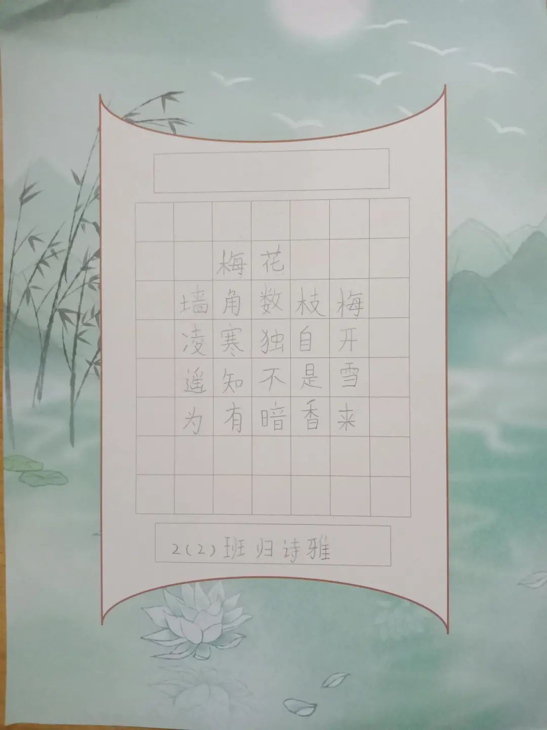 二年級(jí)的孩子們?cè)诿利惖臅?shū)法紙上書(shū)寫(xiě)王安石的《梅花》,大家沉醉其中,佳作層出不窮。