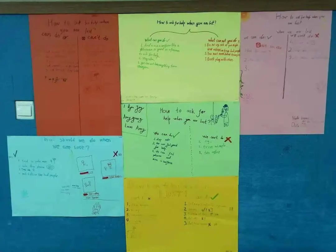 以教材為主線,結(jié)合學(xué)情整合學(xué)習(xí)資源;在主題引領(lǐng)下,關(guān)注貼近兒童生活的話題并進(jìn)行延伸;以心理小游戲作為熱身環(huán)節(jié),關(guān)注心理健康,擴(kuò)展認(rèn)知,拓展思維。本課以閱讀寫作課型讓學(xué)生學(xué)習(xí)走丟以后如何求助,小組合作制作海報告訴他人如何求助,最后提高防范意識,預(yù)防不被走丟。從學(xué)會“求助”到“助人”最后升華到“自助”緊扣主題,培養(yǎng)學(xué)生英語閱讀素養(yǎng),掌握閱讀策略,提取信息以及解決問題的能力。