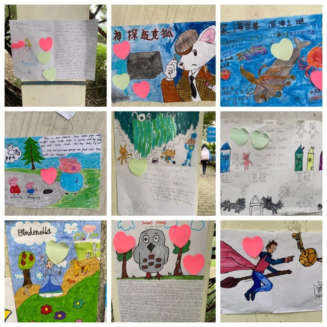 另一個(gè)精彩的活動(dòng)是藝術(shù)長(zhǎng)廊漫步-我最喜歡的書中角色海報(bào)展。滿懷自豪的帶上“我愛閱讀”的閱讀周紀(jì)念徽章,同學(xué)們漫步長(zhǎng)廊,欣賞彼此的海報(bào),哇,內(nèi)容是五花八門,形式是各種各樣,有的孩子還穿上了最喜歡的書中人物的服裝,直教人眼花繚亂。