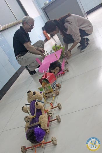 歷時30分鐘,每個小組都經(jīng)歷了提議——實踐——失敗——重新提議的過程,有些小組甚至失敗10次。但最終集合所有成員的智慧,每個小組都成功地完成了任務(wù)。同學(xué)們的創(chuàng)造力受到了Dr. Joe的高度贊揚。最后,4個小組的作品成功地連接成了一列火車,同學(xué)們爆發(fā)出了開心的笑聲。