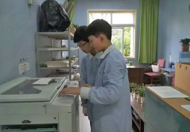 8點(diǎn)20分,負(fù)責(zé)資料復(fù)印工作的兩個(gè)男孩開始工作了。“按按鈕,聊天,取出,放下,喝茶。”這是鄭翔同學(xué)最初對(duì)文印工作的認(rèn)識(shí)。兩位新人心情異常輕松。