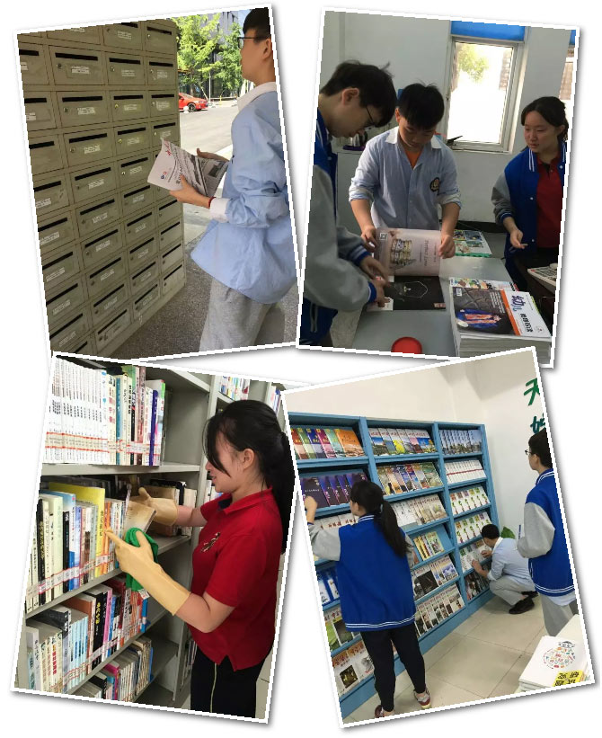 8點(diǎn)半,圖書館工作的三個(gè)孩子開始了他們最為繁瑣的工作。清潔,報(bào)紙分類投遞,雜志清理分區(qū)擺放,書架整理,接待前來閱讀的融合部學(xué)生……