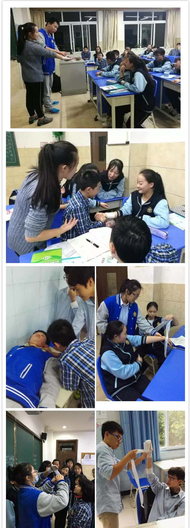 學(xué)生們課堂上學(xué)習(xí)包扎與急救的方法技能,