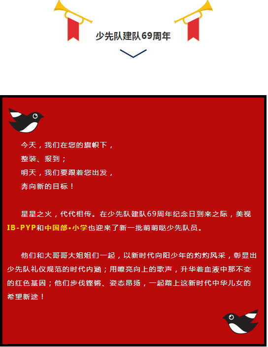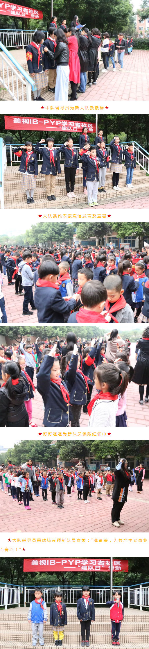 本次主題為“隊歌嘹亮,隊旗飄揚”的建隊日活動是我校踐行IB的全納理念邁出的重要一步,包容接納所有孩子成為光榮的少先隊員。在美視,你們都是“紅領巾”!