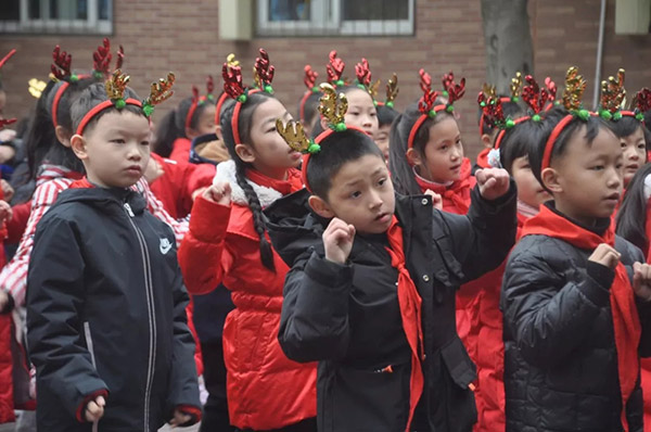 開(kāi)幕式上,一、二年級(jí)的乖乖們頭戴鹿角,歡快地演唱了”Merry Christmas”,老師們都被他們認(rèn)真可愛(ài)的樣子“萌”到了!