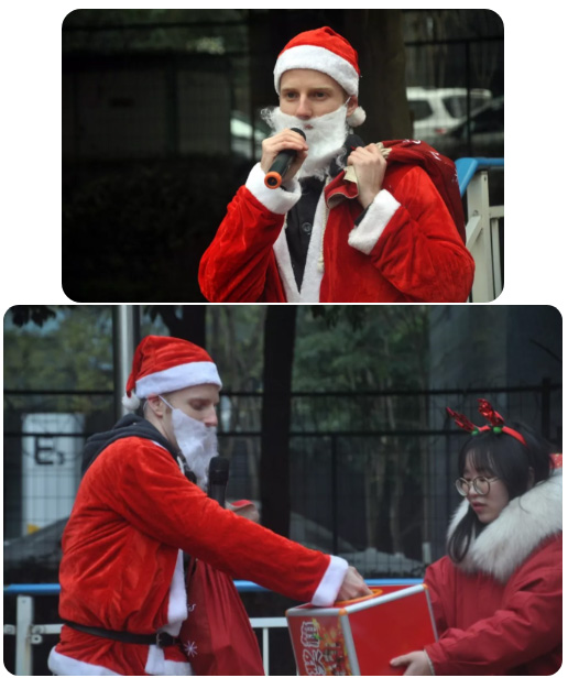 全校合唱“Santa Claus is coming to town”的時(shí)候“圣誕老人”帶著禮物出場(chǎng)了,全場(chǎng)沸騰了!他告訴孩子們,他帶著禮物從遙遠(yuǎn)的北極趕來(lái),給今年最努力的孩子分發(fā)禮物。隨后他從“抽獎(jiǎng)箱”里抽取了2個(gè)幸運(yùn)班級(jí),把禮物送給了他們。獲得禮物的孩子們太開(kāi)心了!