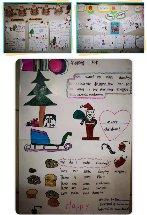 我們的樓道里也充滿了節(jié)日氛圍。走進(jìn)一樓樓道,首先映入眼簾的是三年級(jí)孩子的作品,原來(lái)是孩子們要包餃子吃呢。這是孩子們結(jié)合課堂教學(xué)內(nèi)容,自己做的全英文的包餃子物品清單和做餃子的方法。
