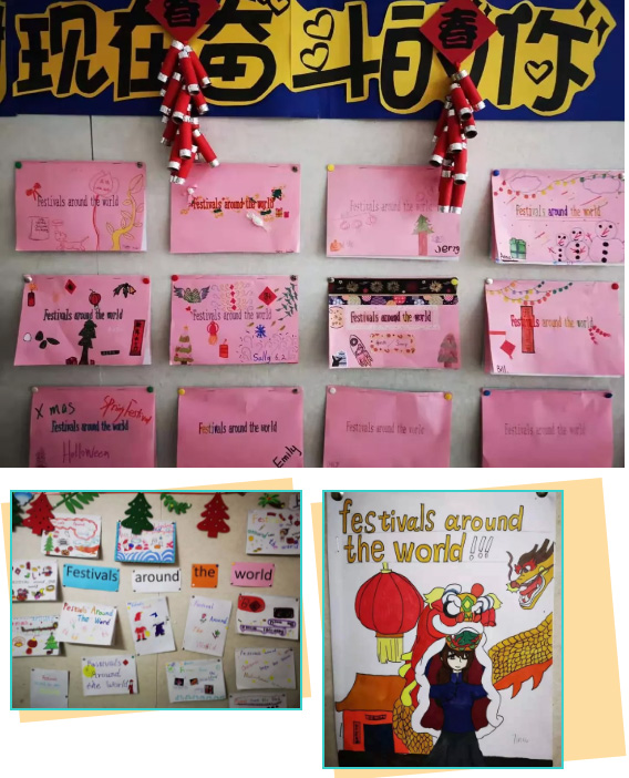 再來(lái)看看三樓的樓道外墻。六年級(jí)的孩子聚焦國(guó)際文化與國(guó)際理解,對(duì)比中西方各種節(jié)日活動(dòng)。既了解咱們中國(guó)的傳統(tǒng)節(jié)日和習(xí)俗,也關(guān)注其他國(guó)家的特色節(jié)日,并寫(xiě)出自己的思考與見(jiàn)解。