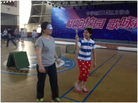 家長(zhǎng)們雙眼被嚴(yán)嚴(yán)實(shí)實(shí)地蒙住,由孩子通過(guò)鈴鼓的聲音引領(lǐng)著前進(jìn)。途中,還得繞障礙物轉(zhuǎn)圈才能繼續(xù)前行——這拼的可是實(shí)力??!