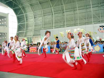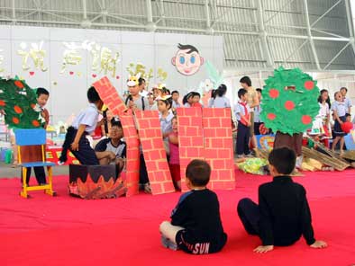英語實(shí)驗(yàn)班的同學(xué)表演英語話劇《三只小豬》