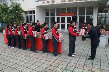 林華玉校長(zhǎng)從各班代表手中接過捐贈(zèng)圖書。