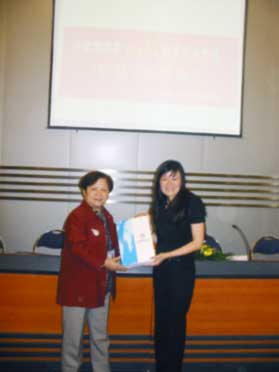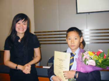 新加坡旅游局大中華區(qū)處長許明鳳女士為獲得征文比賽大中華區(qū)總冠軍獎(jiǎng)的何俊霖同學(xué)頒獎(jiǎng)。