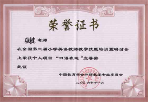 張健老師在全國(guó)第二屆小學(xué)英語(yǔ)教師教學(xué)技能培訓(xùn)暨研討會(huì)上榮獲個(gè)人項(xiàng)目“口語(yǔ)表達(dá)”一等獎(jiǎng)(11/06)