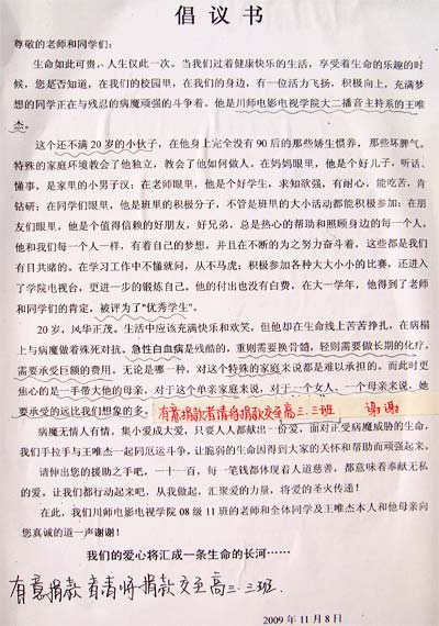 這是一個感人的畫卷,一個病痛,八方支援。學生發(fā)出倡議書,集資善款;校長寫去激勵信,鼓舞心田。善款不多,卻是愛的傳遞。兩個同時代的聲音高歌藍天——愛,能戰(zhàn)勝一切。家長的感謝信,行行淚濺;校長的激勵信,無限溫情,播種陽光。相信,王唯杰同學,戰(zhàn)勝病痛,我們一起共擁明天。