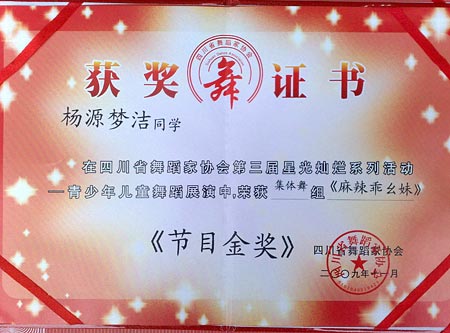 楊源夢潔同學榮獲四川省舞蹈家協(xié)會第三屆星光燦爛系列活動-青少年兒童舞蹈展演中集體舞《麻辣乖么妹》節(jié)目金獎
