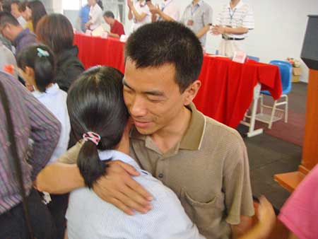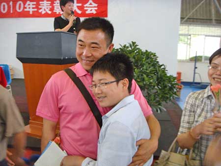 表彰大會上還有一幕特別地令人難以忘懷——大會主持人邀請學(xué)生的家長上臺接受孩子的感恩!當(dāng)孩子們把手中的鮮花獻(xiàn)給父母的時候,當(dāng)孩子懂事地?fù)肀Ц改傅臅r候,臺上臺下的時空像是被親情凝固了——有的家長笑得很開心,有的家長噙著淚水,有的家長任由眼淚奔放,有的家長與孩子緊緊相擁……