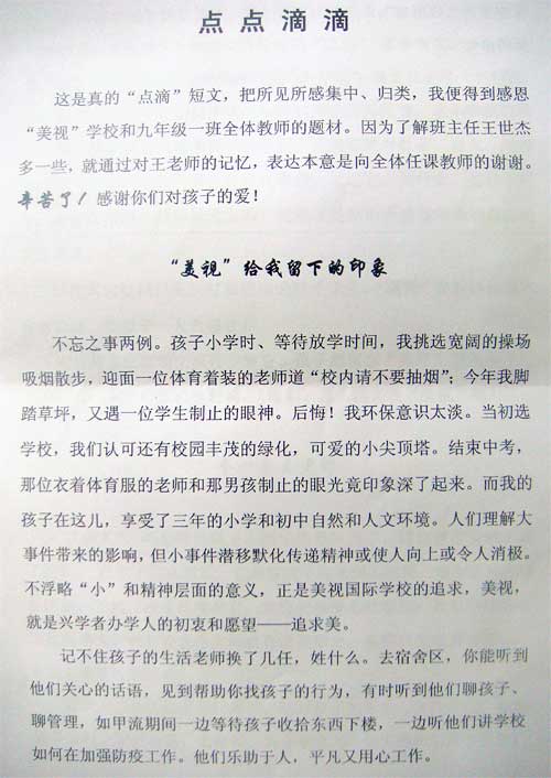 下面是九年級(1)班喬意之同學(xué)的父親秦疆先生在女兒畢業(yè)后寫給中學(xué)部校長文安娜女士的一封以《點點滴滴》為題的信,借以表達(dá)對初三年級全體老師的感謝之情。信的全文如下: