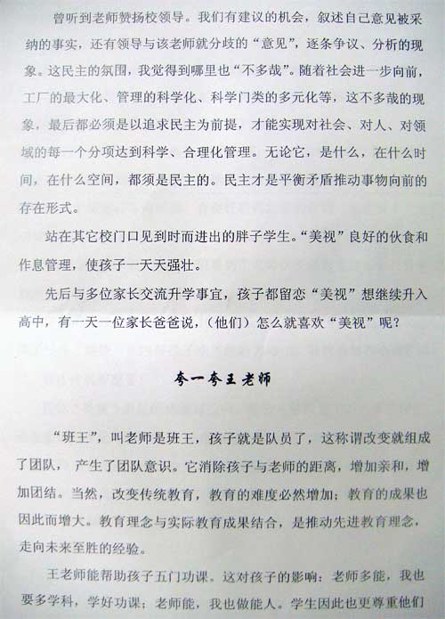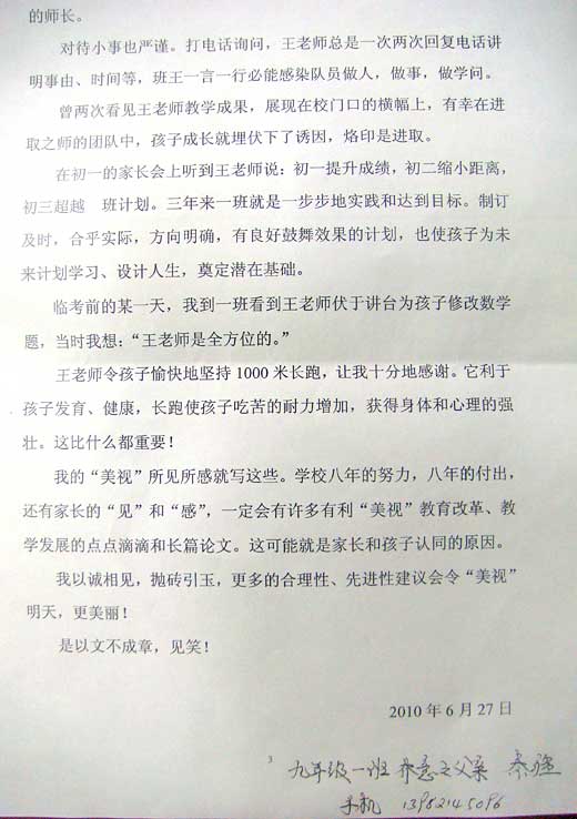 一個優(yōu)秀的老師是怎樣去影響學(xué)生的,一個優(yōu)秀的班主任又是怎樣去感動家長的,一個優(yōu)秀的學(xué)校又是如何獲得學(xué)生、家長認(rèn)可的?王世杰老師,初2010級初三(1)班班主任,被學(xué)生尊稱為“班王”。班王以其德影響學(xué)生,以其能慰籍家長、以其行榮譽(yù)學(xué)校。王世杰做了一個教師一個班主任應(yīng)做之事,盡了一個班主任應(yīng)盡之責(zé)!