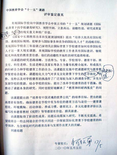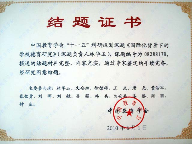 2007年4月由林華玉校長牽頭,成立了《國際化背景下的學(xué)校德育研究》課題研究小組。該小組研究的課題經(jīng)省教育學(xué)會推薦被批準(zhǔn)為中國教育學(xué)會“十一五”規(guī)劃課題。此后,在有關(guān)專家指導(dǎo)下,課題組在理論探索與學(xué)校德育實(shí)踐相結(jié)合的基礎(chǔ)上進(jìn)行了三年的研究。今年4月課題組完成了預(yù)期的研究任務(wù),寫出了結(jié)題報告,申請結(jié)題。中國教育學(xué)會委托四川省教育學(xué)會組建了以省教育廳副廳長何紹勇教授為組長,以査有梁、姚文忠、紀(jì)大海、張乃文、顧美玲等教授為組員的專家評審組。專家評審組認(rèn)真審閱了課題組提交的結(jié)題報告,查看了課題研究的詳實(shí)資料,一致認(rèn)為本課題視野開闊,立意高遠(yuǎn),前瞻性強(qiáng),研究成果顯著,有較強(qiáng)的現(xiàn)實(shí)意義和推廣價值,同意結(jié)題。今年6月1日中國教育學(xué)會為本課題頒發(fā)了結(jié)題證書。