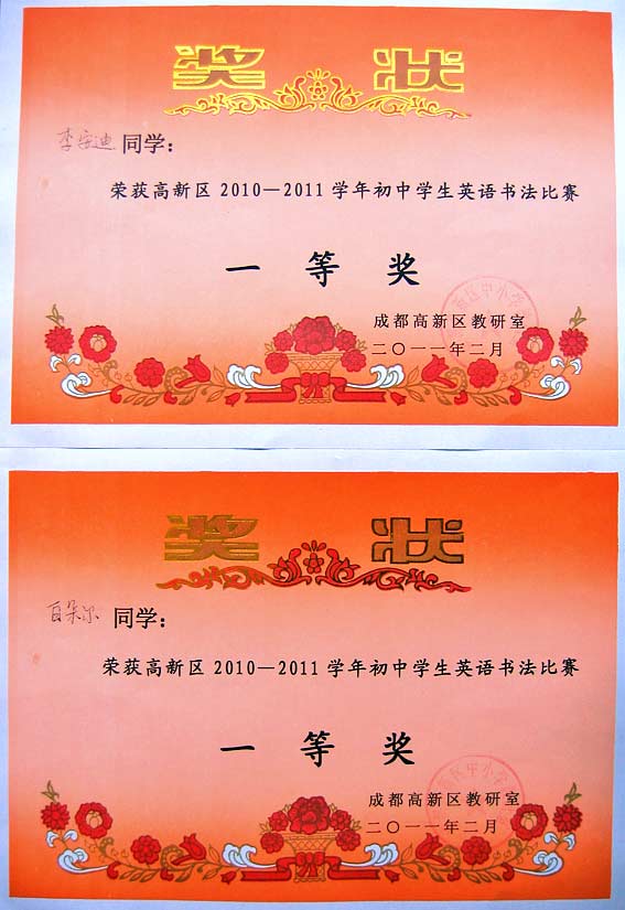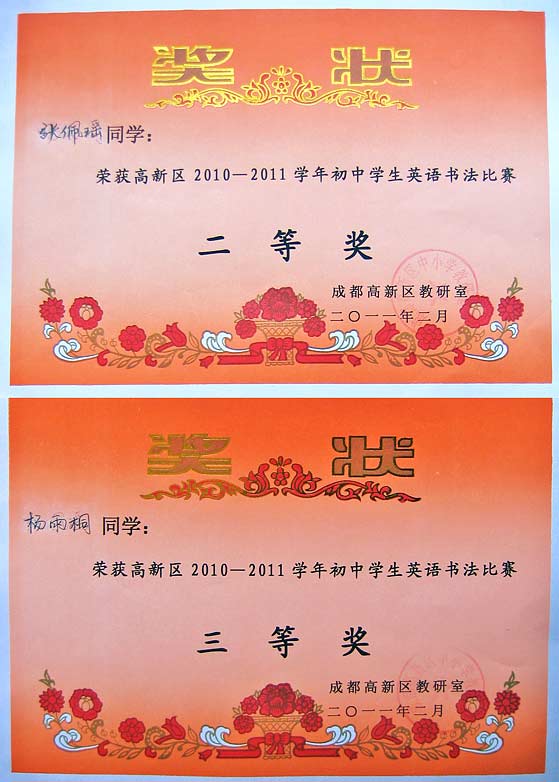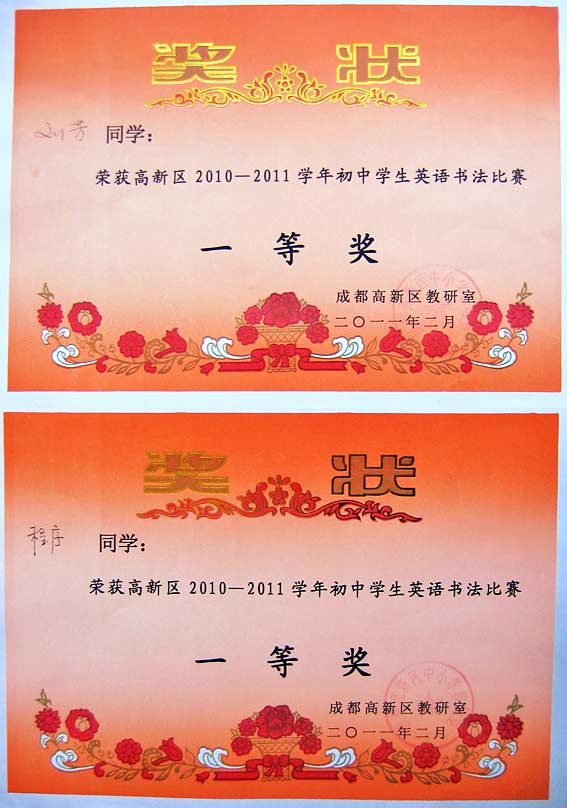 美視學子在高新區(qū)2010-2011學年初中學生英語書法比賽中獲獎