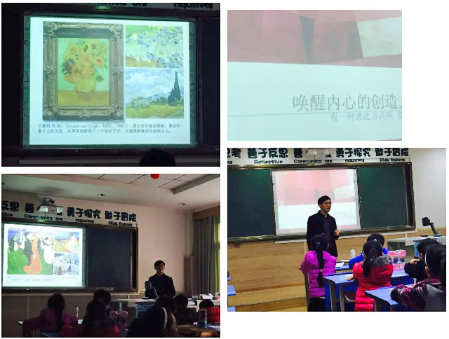 課堂上,曾叔叔通過(guò)引導(dǎo)小朋友們賞析名畫(huà),觀察大師們是怎樣用線(xiàn)條、色彩來(lái)表現(xiàn)自己對(duì)現(xiàn)實(shí)世界的感受,讓孩子們明白,繪畫(huà)和作文、音樂(lè)、舞蹈一樣,也是一種表達(dá)方式,我們可以展開(kāi)想象的翅膀,運(yùn)用夸張、擬人等方法來(lái)喚醒自己內(nèi)心的創(chuàng)造力,表現(xiàn)自己眼中的世界、表達(dá)自己內(nèi)心的感受。